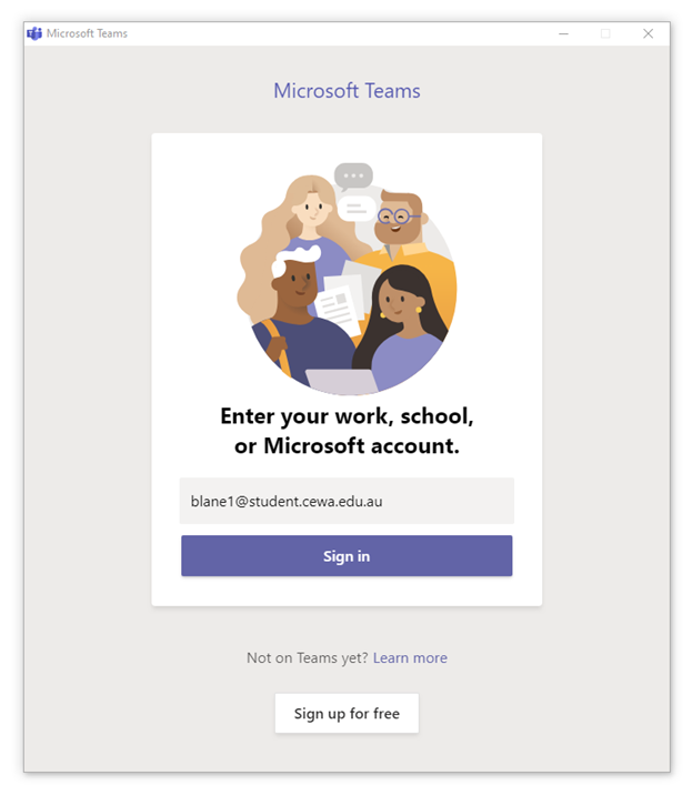 4. Now Teams will start installing to your laptop. When it's finished it'll pop up with the screen below and ask you to sign in with your CEWA Student Email address. Once you've signed in, you should see all the Teams you've been added to.